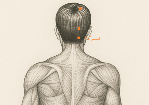 首をやや前に倒すと、後頚部にできる2本の太い筋(僧帽筋外縁)の内側に指が落ちるポイント。