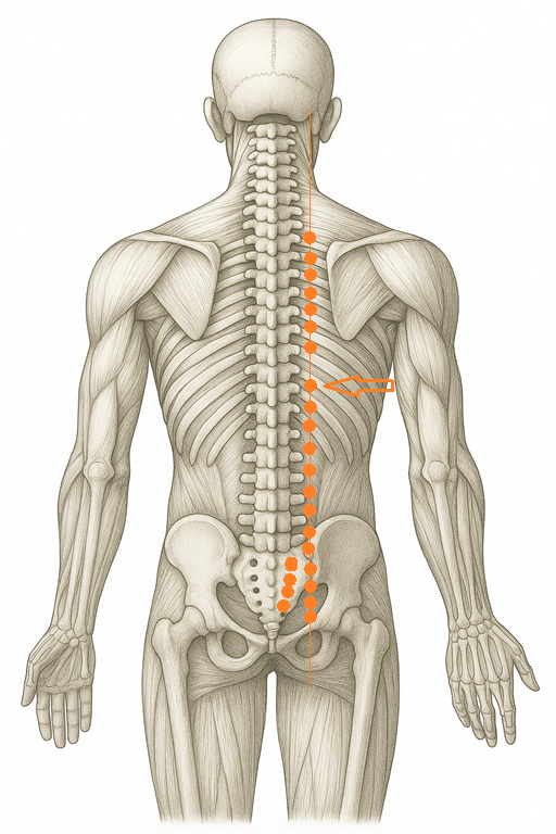 肩甲骨下角よりやや下方、脊柱の外側ライン(内膀胱線)上に位置。