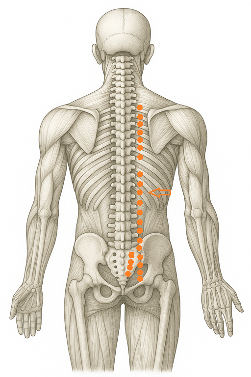 背中の中央よりやや下、腰に近いエリアに位置する。