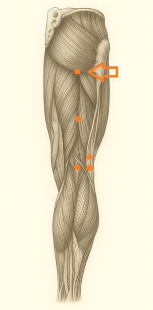 殿溝(臀裂と大腿の境界)の中央部、坐骨神経の真上に位置する。