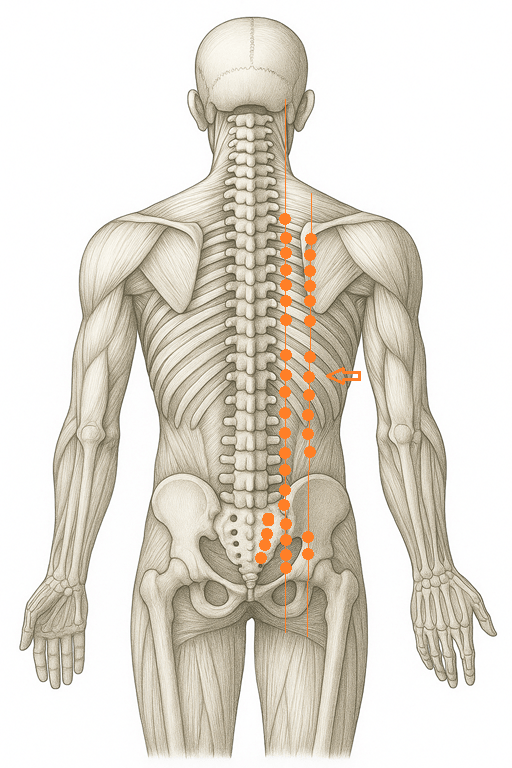身体を前屈させた際、背中に現れる“熱と力の張り”が最も感じられるポイント。肝兪・魂門の下方に連なり、胆兪に向かう要点。