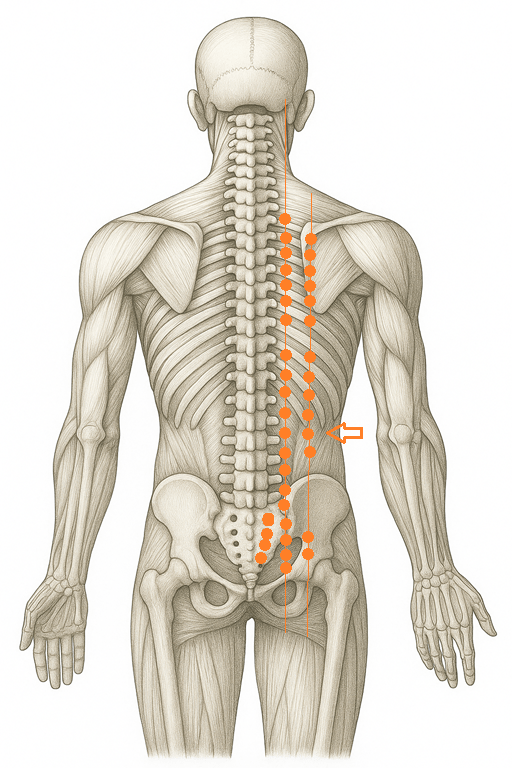 腰部の中心線からやや外側に位置し、骨盤内臓の気の出入口ともいえる位置にあたる。
