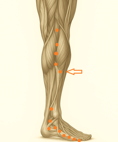 外くるぶし(崑崙穴)から膝の方向へ約7寸上方、