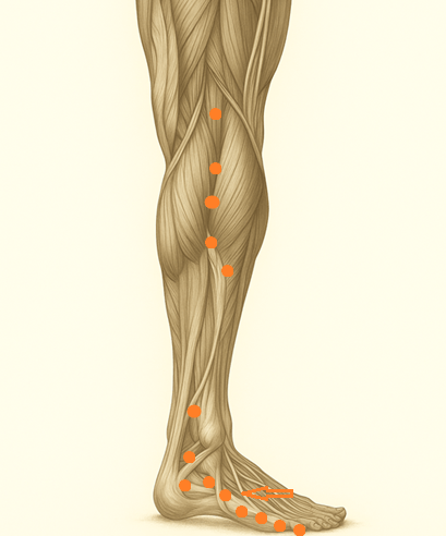 足を軽く外返しにすると、筋腱の間に明確なくぼみが触れる。