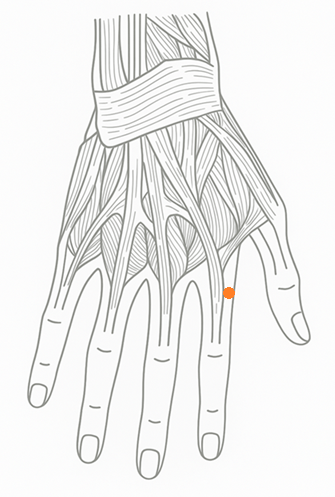 示指(人差し指)と母指の間、第2中手指節関節(MCP関節)のすぐ下の橈側、やや手の甲寄りの陥凹部。皮膚のしわが交差するあたりを指で探ると、ややひんやりとした感覚と圧痛を感じやすい場所にある。