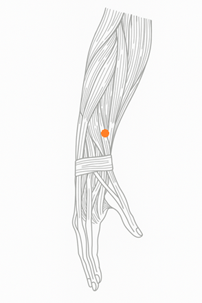 前腕後側、陽溪穴から曲池穴に向かって3寸上。橈骨と尺骨の中間、前腕のやや橈側の陥凹部に取る。