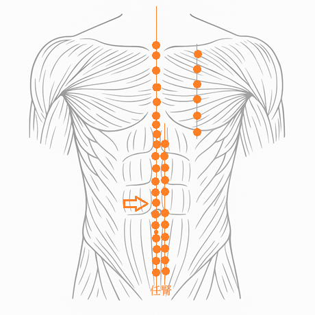 神闕穴(へそ)の上1寸、腹直筋の正中(白線)上に位置する。