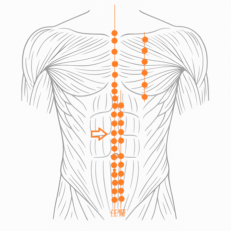 神闕(しんけつ:へそ)の上3寸で、中脘(ちゅうかん)穴の下1寸。腹部正中線(白線)上。