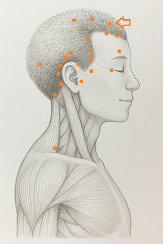 前頭部から側頭部へ向かう際、眼の真上をたどり後頭にかけて開かれる「視界の延長線」にある重要点。