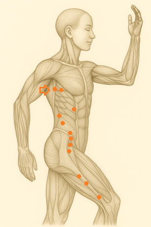 触診では深呼吸時の肋骨の広がりを意識すると定位しやすい。胸郭の流れに呼応する「気の淀み」が溜まりやすい部位でもある。
