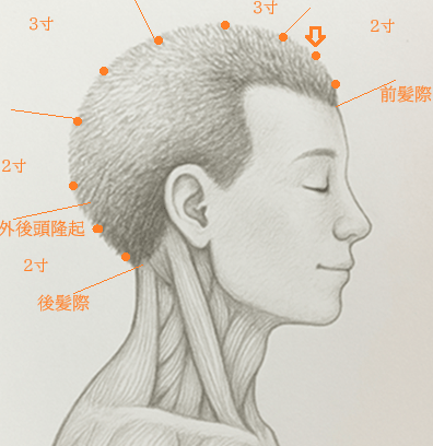 前髪際から1寸(約3cm)後方の正中線上。額の生え際直上、額中央の奥に位置する。