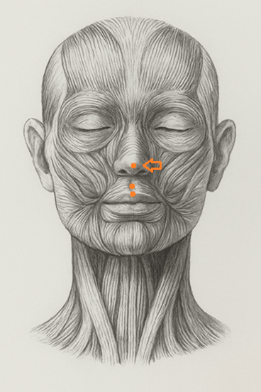 鼻尖の中央陥凹部。鼻柱の最も下、両鼻孔の間にある小さなくぼみに取る。皮膚の柔らかさとわずかな湿気が目安となる。鼻の呼吸を一度止め、静寂の中で探ると正中の“気の出入り口”としての存在感が感じられる。