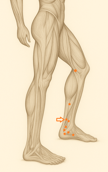 脛骨とアキレス腱の間を指でなぞると、やや圧痛を感じる小さなくぼみ。