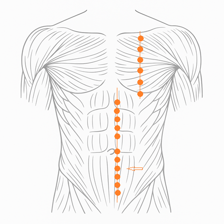 任脈の石門穴(関元の1寸下)の外方5分、臍下2寸の腹直筋中に取る。仰臥位で腹部の緊張を確認しながら、左右対称に圧痛・硬結を探る。腹直筋の収縮に合わせてわずかに沈みこむ部位が目安となる。
