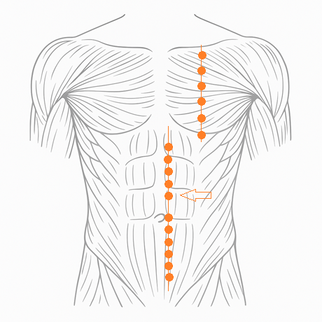 仰臥位で腹部を緩めた状態にし、腹直筋の外縁を軽く指頭で触診して、わずかに圧痛や抵抗を感じる部分を探すとよい。