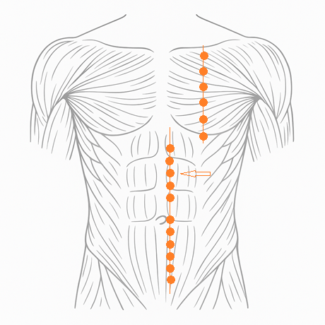 腹直筋の筋腹上にあり、腹部の正中からわずかに外側、肋骨弓の下方に近いエリア。