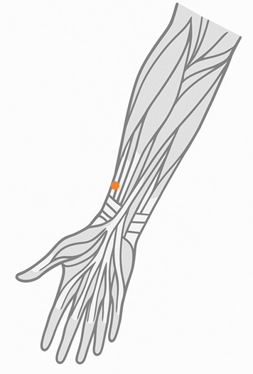 前腕の前橈側で太淵穴から尺沢穴を結ぶ線上の上1寸5分に取る。橈骨茎状突起のすぐ上で、腕橈骨筋腱の橈側に位置。