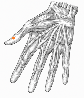 母指(親指)の橈側爪甲根部、爪の付け根の外側角を約1分(約2mm)離れたところ。
