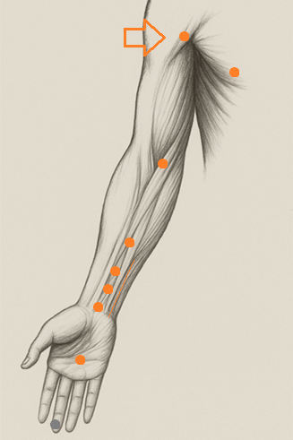 肩を自然に落とした状態で、上腕内側の柔らかいくぼみに位置する。