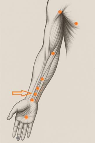 手関節の大陵穴から曲沢穴に向かって上2寸。