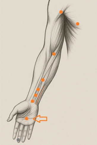 手掌部で、手を軽く握ったとき中指と薬指の先端が触れるあたり。