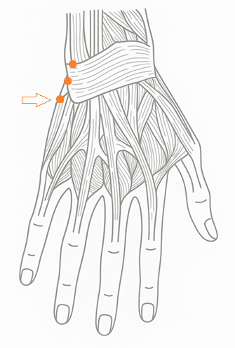 手を軽く握り、手背を観察すると、小指の延長線上にくぼみが現れる箇所。
