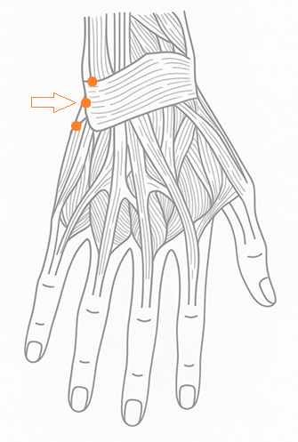 手関節後面、尺骨茎状突起の下で、小指側手背にある明瞭なくぼみ。