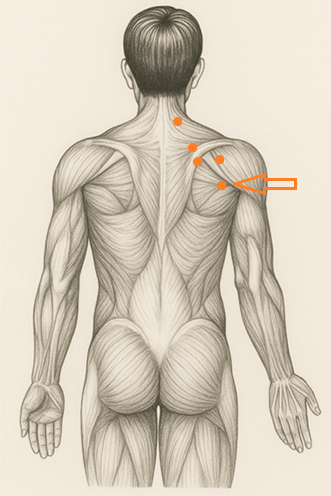 肩甲骨の裏側に指を沿わせ、骨のくぼみに自然に指が吸い込まれる場所。