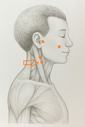 下顎角の後下方、胸鎖乳突筋の前縁で、扶突(LI18)と天容(SI17)を結ぶ線の中央に取る。