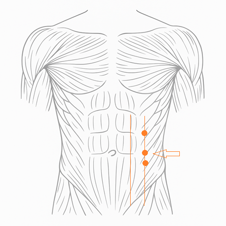 仰臥位で腹筋を弛緩させ、臍中央から外側へ指4本分を測り、肋骨弓の下縁との関係で圧痛や反応点を確認して定める。