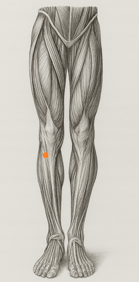 脛骨の外側縁をたどると圧痛やわずかなくぼみがある位置。