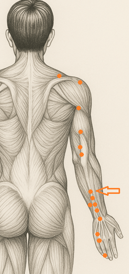 陽池穴の上5寸、前腕背側で総指伸筋と小指伸筋の間。