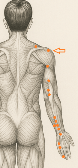 - 三焦経に属する肩髎は、「氣の通り道」を物理的に支える関所。経絡の流れがここで滞ると、上肢や肩背の可動域が制限され、呼吸も浅くなる。