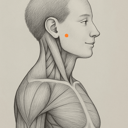 軽く歯を噛みしめて咬筋の膨らみを確認し、その前縁で耳垂のやや下方にある陥凹を探す。ツボ探しの際は、咬筋が弛緩したときにわずかに指が沈み込む感覚を目安とする。