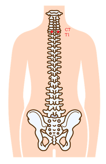 第7頚椎棘突起と第1胸椎棘突起の間(大椎穴の外方5分)に取る。 喘息穴の内方約5分。