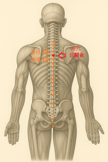 心肺の気の渋滞を開き、胸中の閉塞を流す“背中の巨闕門”