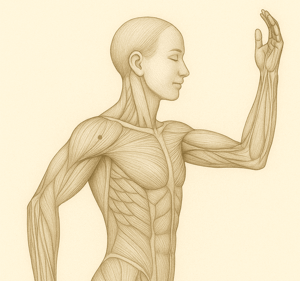 肩髃穴が外側から肩を整えるのに対し、肩内陵は前方から肩関節の滑走性を回復させる役割を持つ。