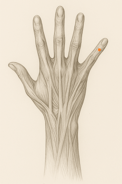 小指第一関節(PIP関節)背側横紋の中央。