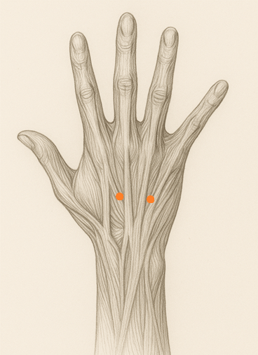 手背にあり、第2・第3中手骨底間の下陥凹部と第4・第5中手骨底間の下陥凹部の2点に取る。