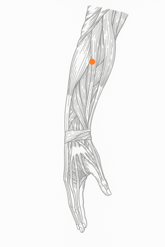 前腕後橈側、曲池穴から下3寸の位置。長橈側手根伸筋と短橈側手根伸筋の間にあり、皮膚を軽く押すことで圧痛点が確認される。