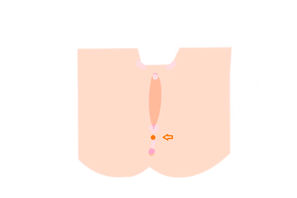 男性では陰嚢と肛門の中間点、女性では後陰唇交会部と肛門との中間点。