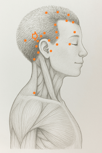 側頭部から後頭部へと移行するカーブの途中にあり、指圧時に軽い圧迫感があるポイント。