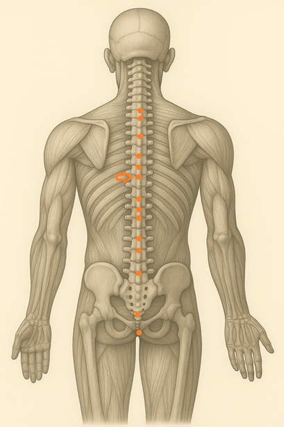 背部のやや中下部、横隔膜の裏あたりに位置し、胸と腹の“境界”を整える要所