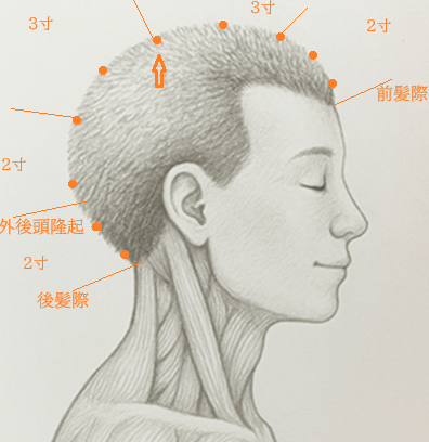 前髪際を入ること5寸の正中線上。両耳の先端を結ぶラインと、頭頂部の正中線が交差する点。