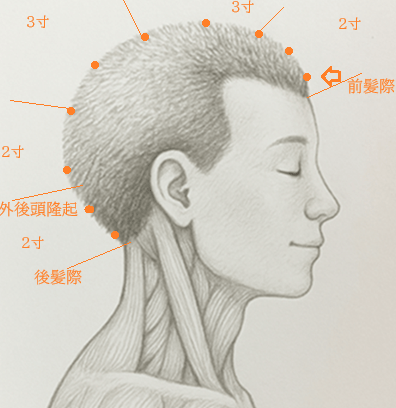 前髪際を入ること5分(約1.5cm)、正中線上。
