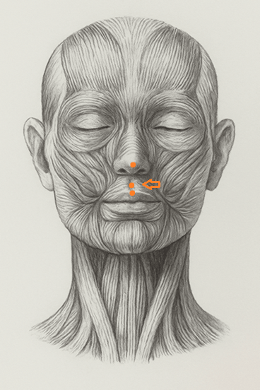 鼻中隔の直下で、人中(鼻と上唇の間)の正中線上に位置する。唇を軽く閉じた状態で探ると、最も窪んだ一点に“気の滞りやすい澱み”を感じる。この点を指先で微細に感じることが、診断と治療の起点となる。