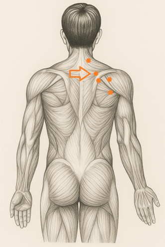 姿勢を正し、肩甲骨内縁をたどると自然に指が落ち着く“外れた守りの角”のような位置。