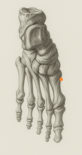 太白穴の後1寸、足の内側縁、第1中足骨底の前下縁に取る。骨の縁をたどるように、やや深部にくぼむ場所に感じる。