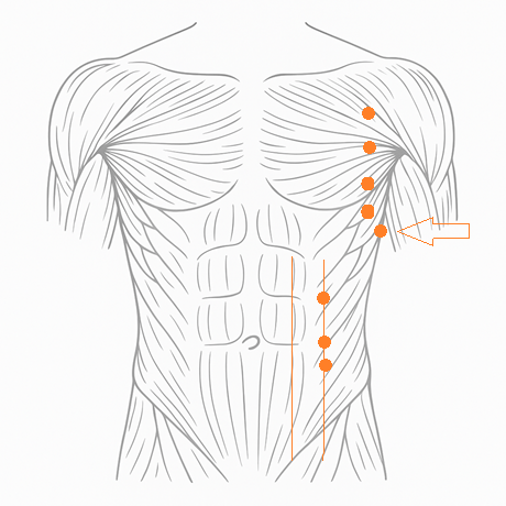 ※腕を自然に垂らした状態で、脇のくぼみから肋骨の丸みに沿って下方に指をなぞり、肋間に触れるところ。呼吸により動くので、吸気時に軽く圧を加えると圧痛点が見つかりやすい。