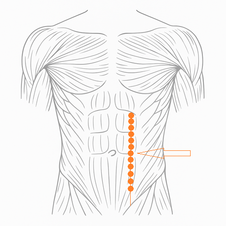 腹直筋の外縁に位置し、触診では軽く押すと“響くような痛み”を感じやすい。